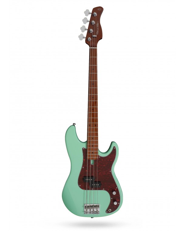 Corps en Aulne d'Amérique du nord, forme du corps: Precision bass type, manche en érable torréfie dur, forme en C, Diapason: 34", Touche en Érable dur torréfié (Radius : 9'5"), Fretless, Sillet:42mm en os, Incrustations noires, Ensemble de capteurs Marcus Vintage-Precision Set, Contrôles Volume et tonalité, Chevalet : Marcus vintage-S, Mécanique: Premium Open gear (Chrome), Boutons : Chrome metal, Pickguard : Tortoise, Finition Mild Green